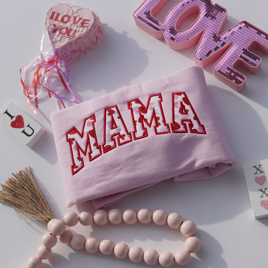 Embroidered Mama Varsity Valentines Heart Applique Sweatshirt for Mom Long Sleeve Womenswear