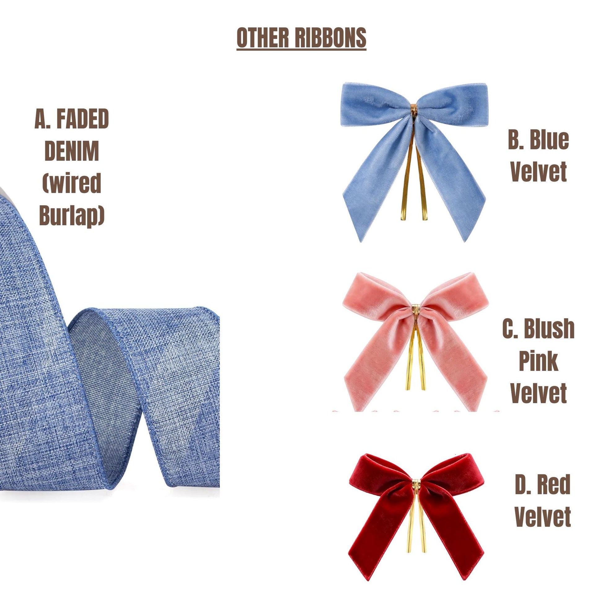 A. Faded Denim (wired burlap) • B. Blue Velvet • C. Blush Pink Velvet • D. Red Velvet