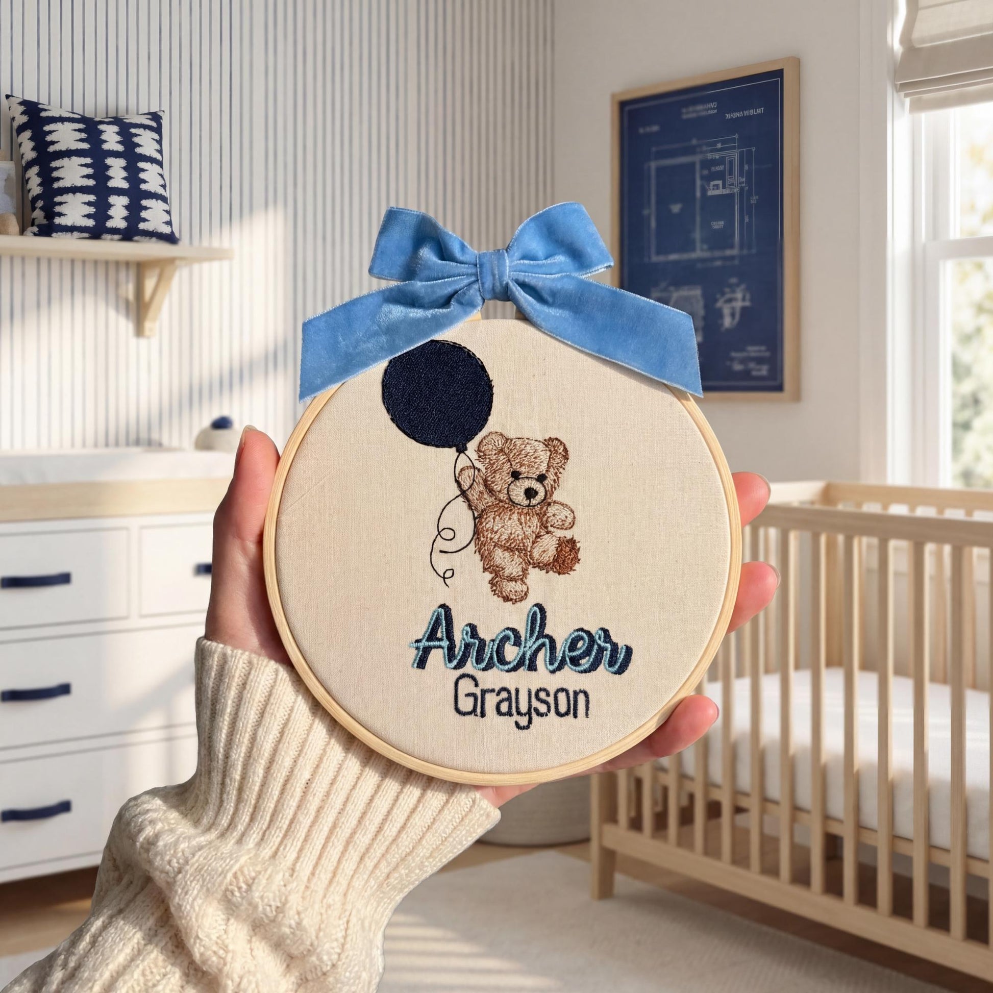 Custom baby name sign embroidered with a teddy bear and balloon for baby shower gifts, newborn gifting, pregnancy announcement, baby name announcement photos, and nursery shelf or wall decor. This is stitched embroidery (not printed) and finished as a display-ready hoop.