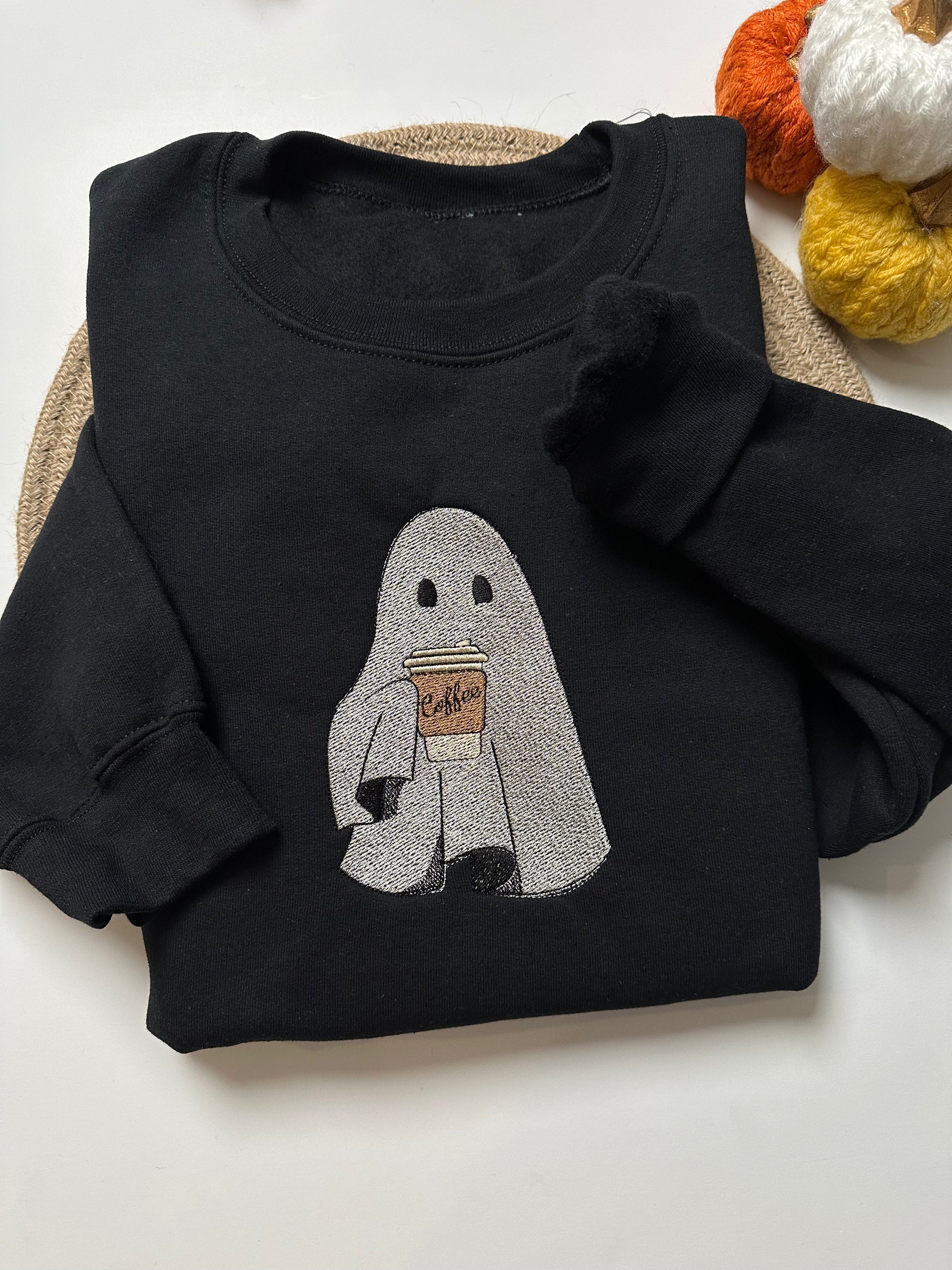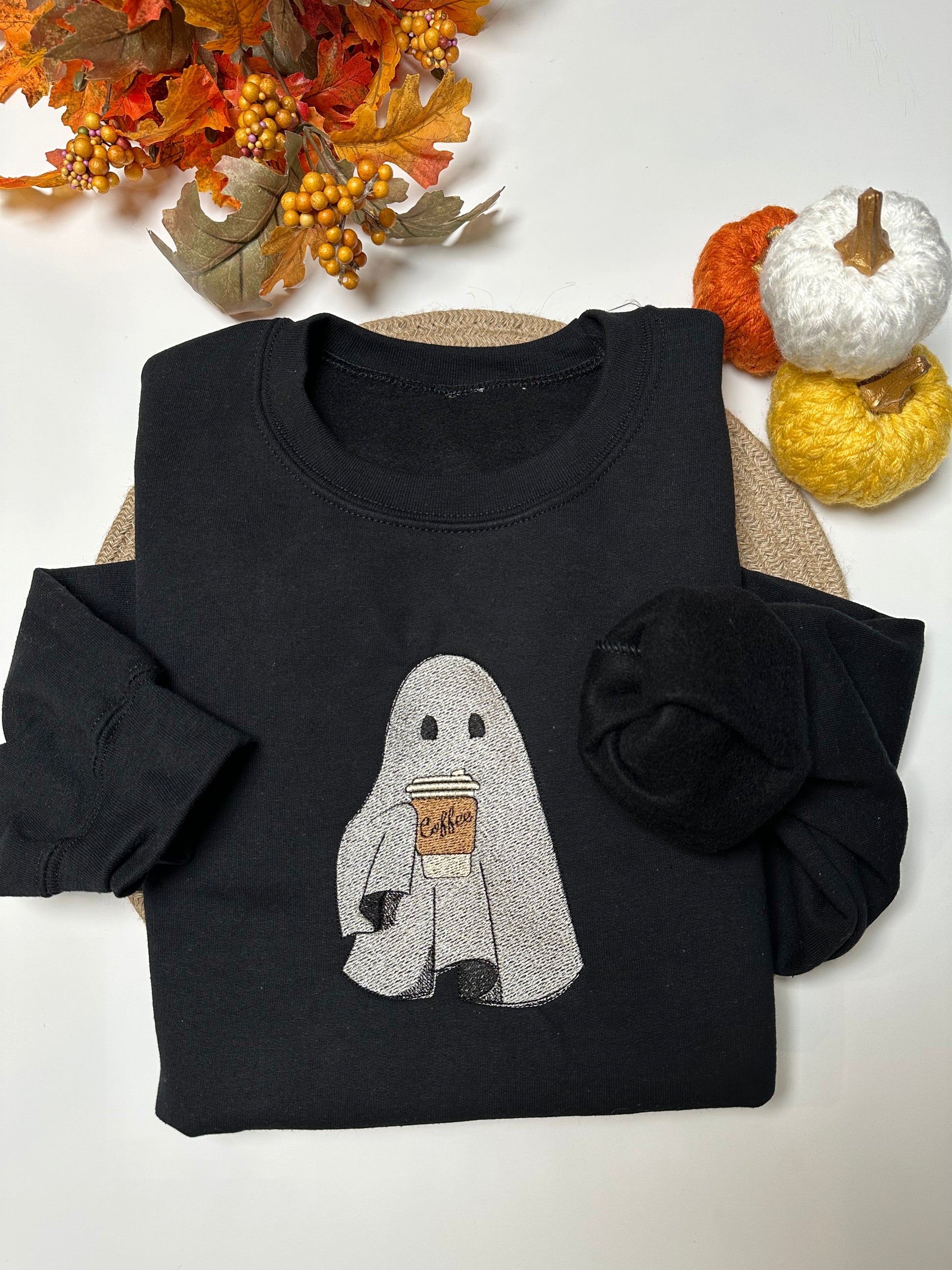 Stand out from the crowd this fall with this super cute coffee drinking ghost embroidered crewneck sweatshirt that also makes for the perfect gift for coffee lovers this halloween! Plus sizes are also available.