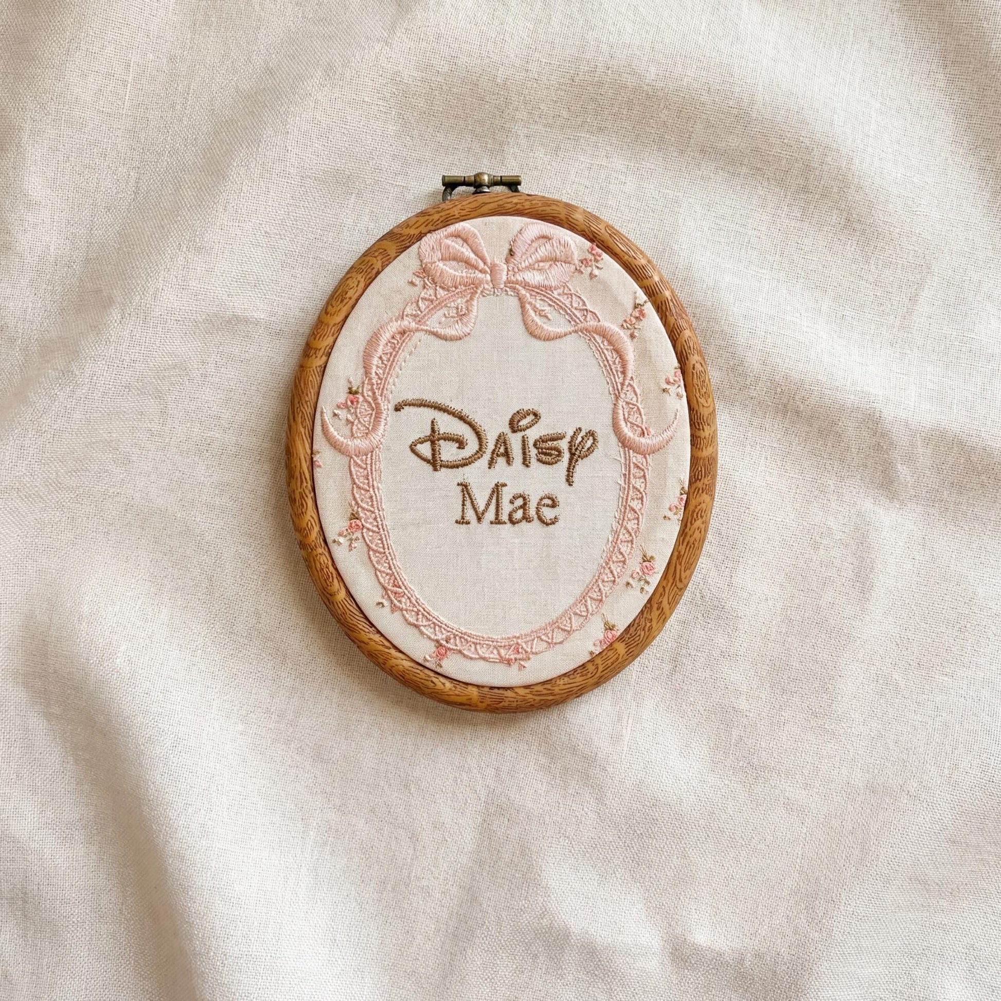 • Personalized embroidered baby name sign in a decorative hoop