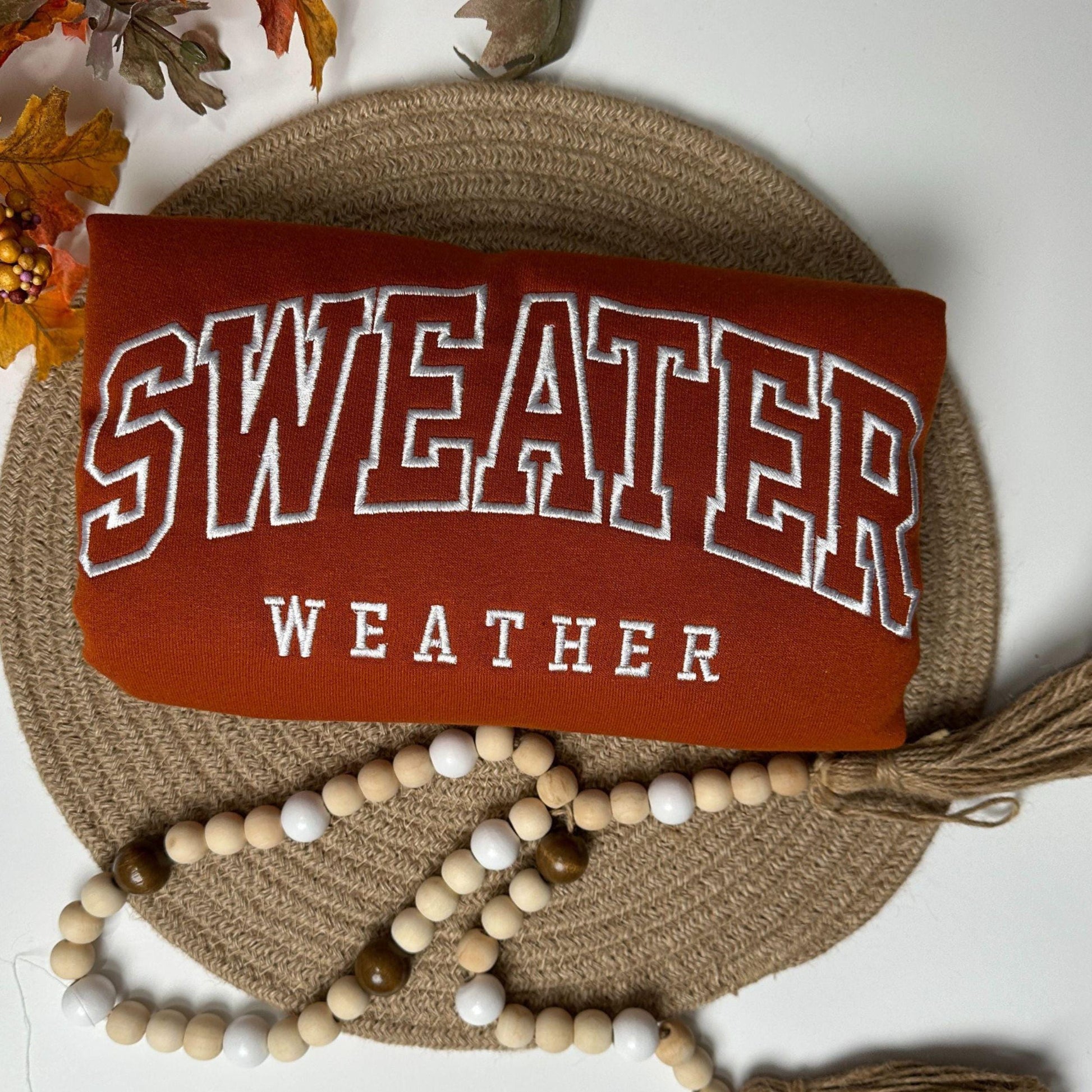 Stay warm and stylish this fall with our Sweater Weather embroidered sweatshirt! Featuring a bold varsity-style “Sweater Weather” design, this cozy crewneck is perfect for chilly autumn days, pumpkin patch trips, and all your fall activities. Stitched with high-quality embroidery for a lasting design, this sweatshirt makes a great seasonal staple or a thoughtful gift for sweater lovers.