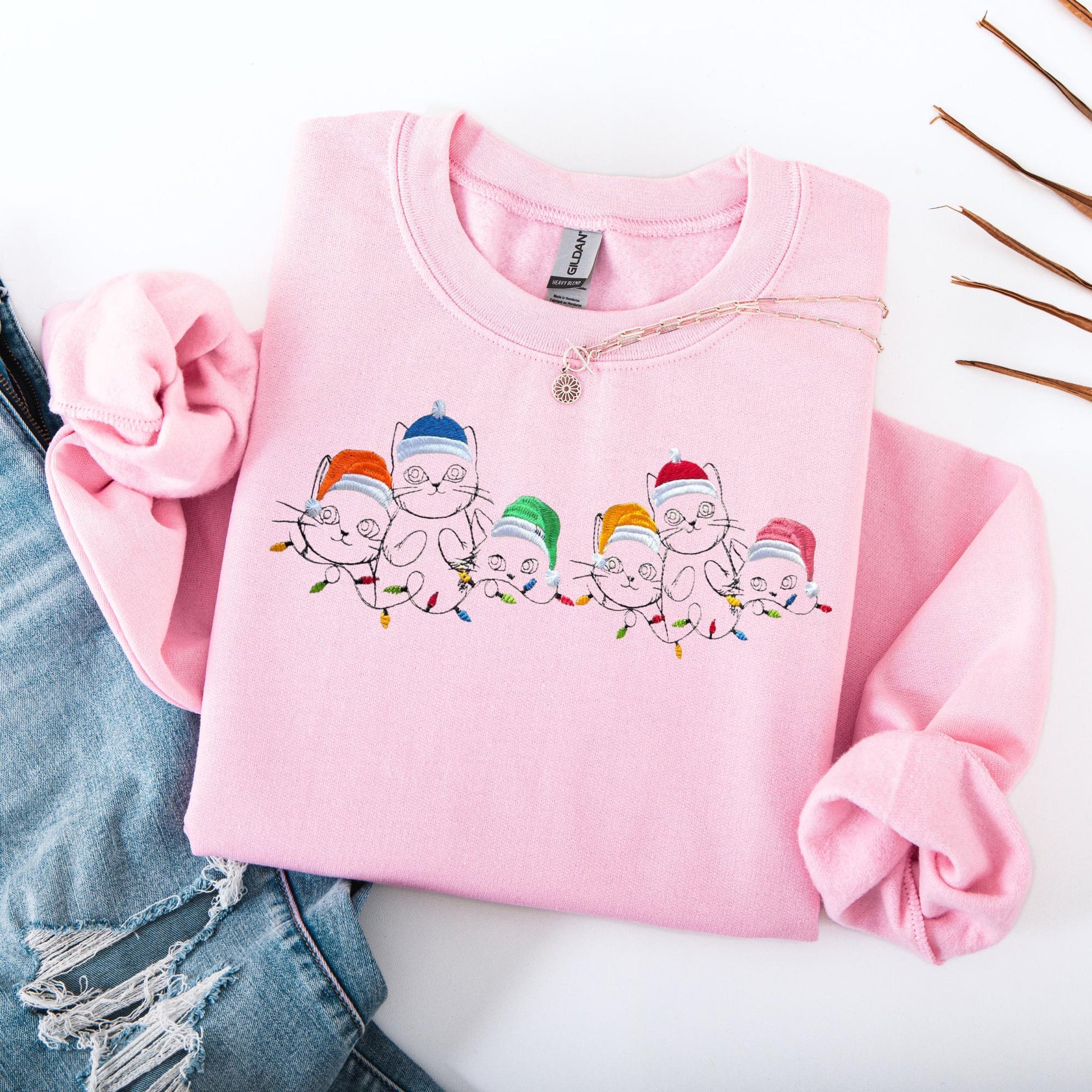 This embroidered crewneck sweatshirt features six playful cats wearing Santa hats and twinkling Christmas lights—bringing warmth, laughter, and holiday charm to your wardrobe. Perfect for Cat Lovers!