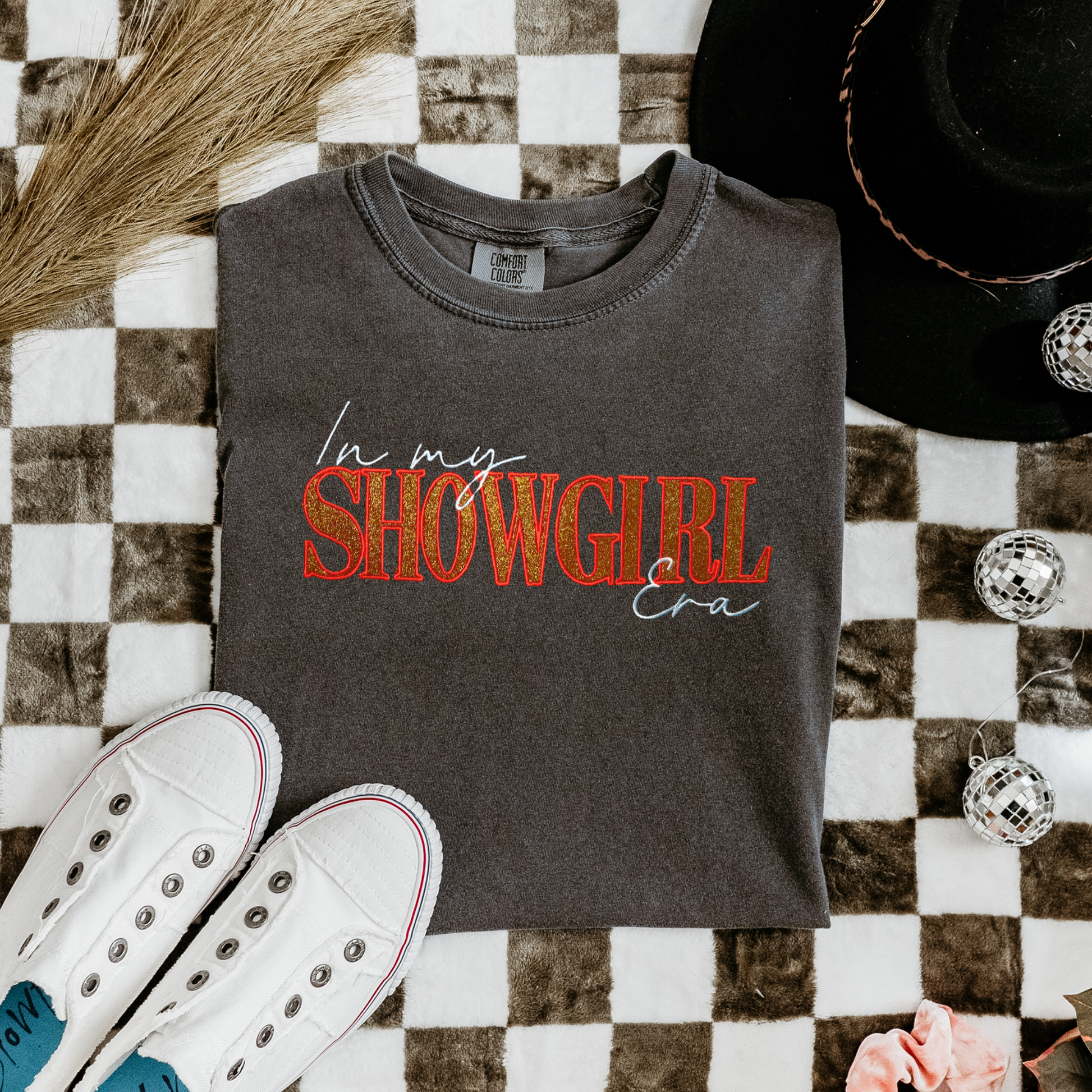 Embroidered In My Show girl Era Glittered T-Shirt, Retro Showgirl Glitter Text Embroidery, Preppy Unisex Show Girl Era Tee, Trendy Concert Crewneck Comfort Color