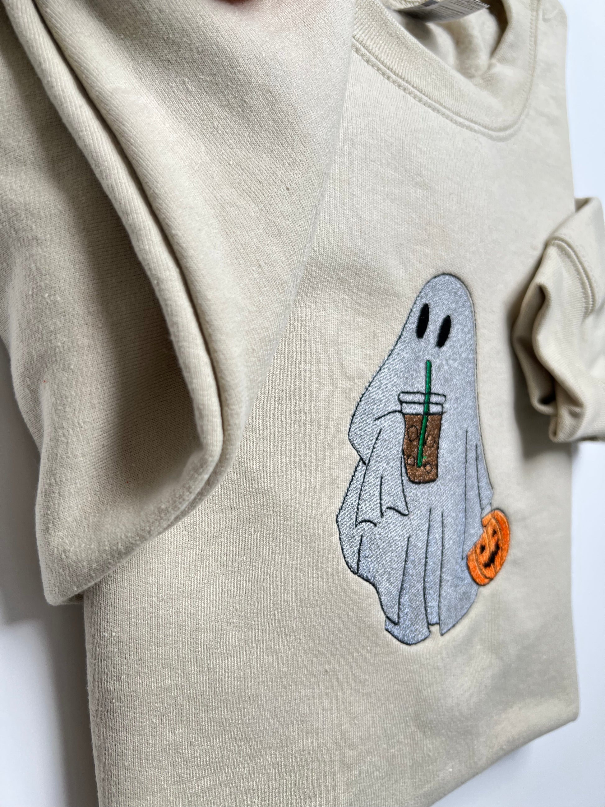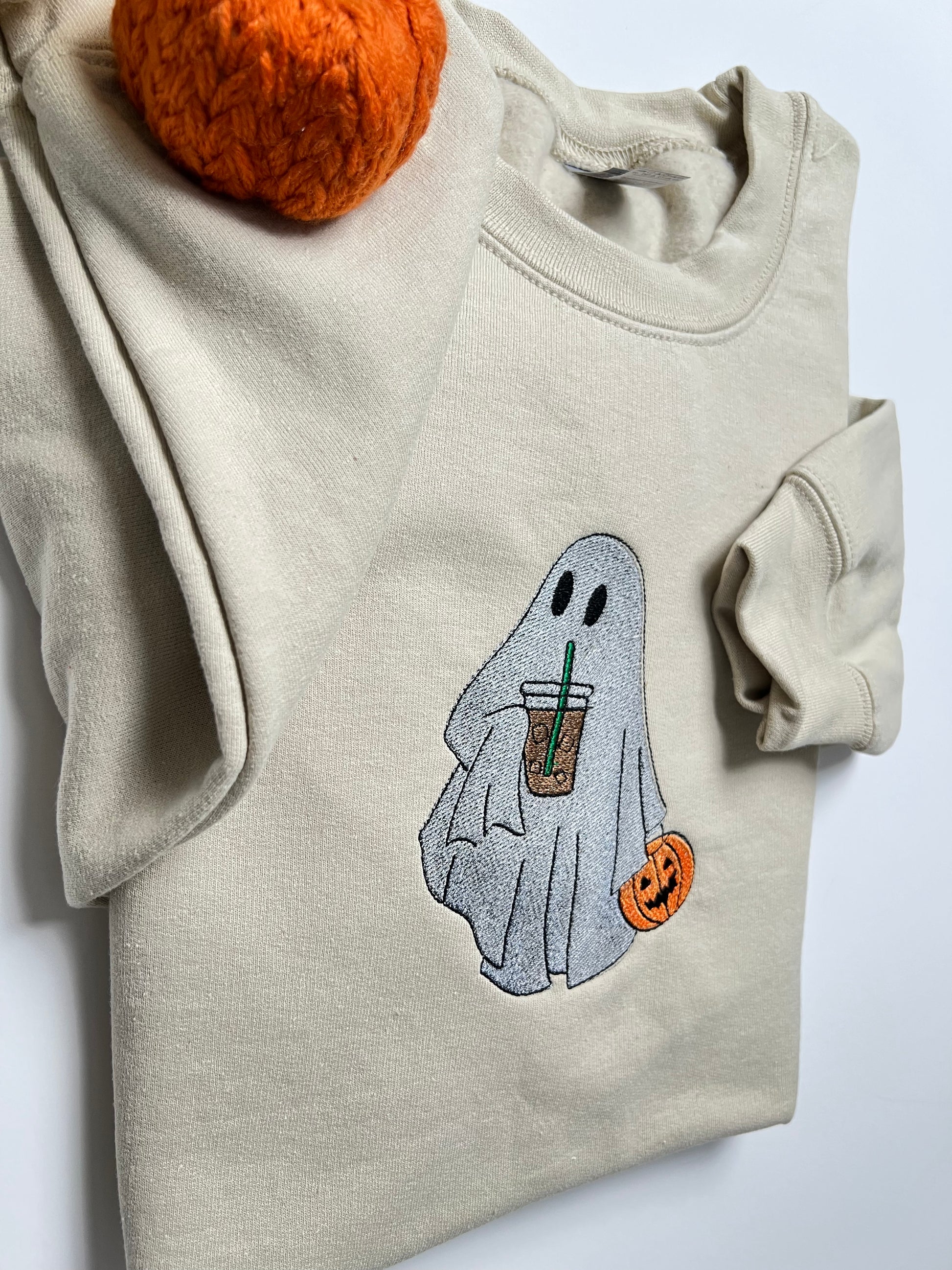 Stand out from the crowd this fall with this super cute iced coffee drinking ghost embroidered crewneck sweatshirt that also makes for the perfect gift for coffee lovers this halloween! Plus sizes are also available.